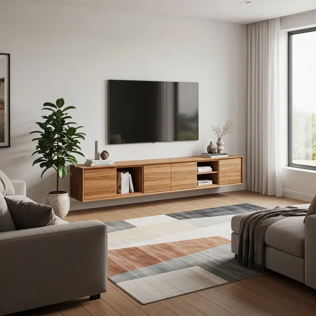 Use a wall-mounted teak console to house your electronics. Keeping the unit off the floor maintains the “weightless” aesthetic and emphasizes the clean wall lines.