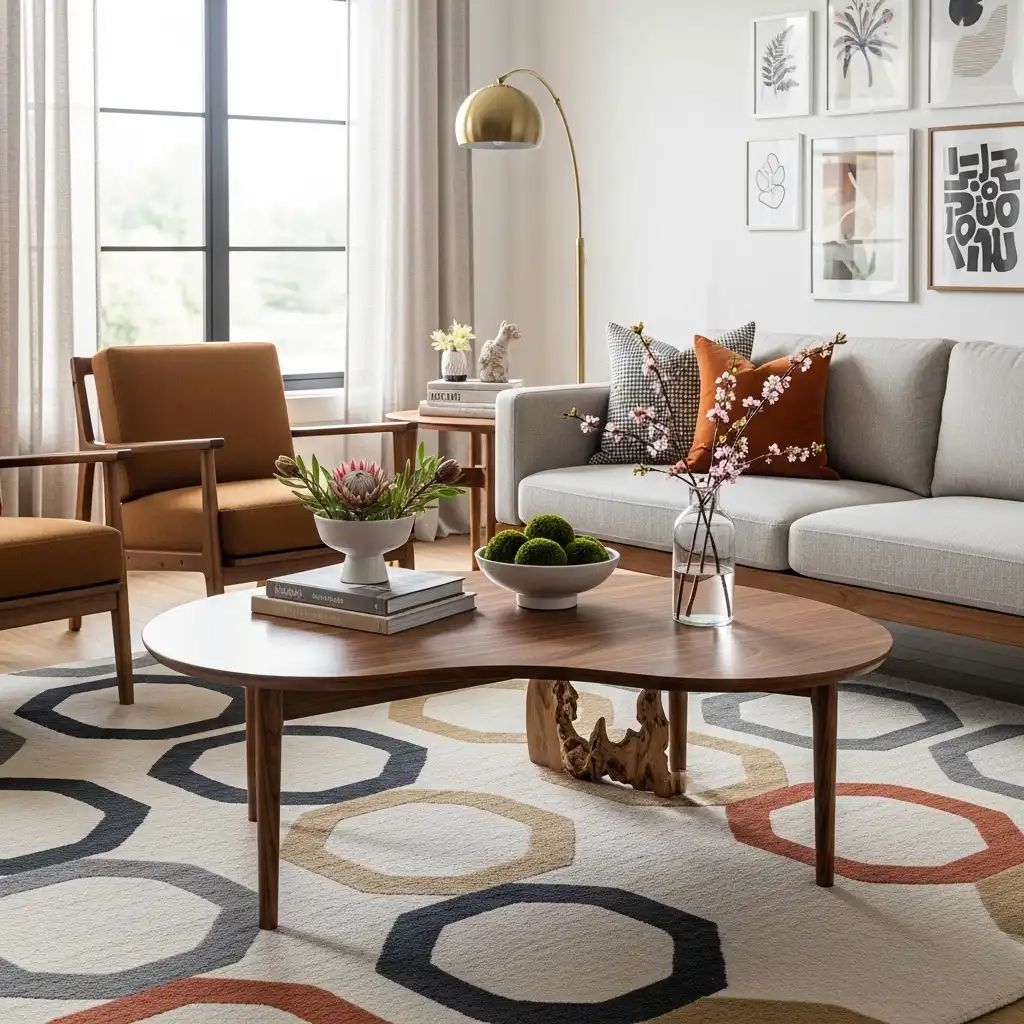 Softened the room’s straight lines with an organic, biomorphic coffee table. A kidney-shaped wooden or glass table adds a playful, human touch to the arrangement.