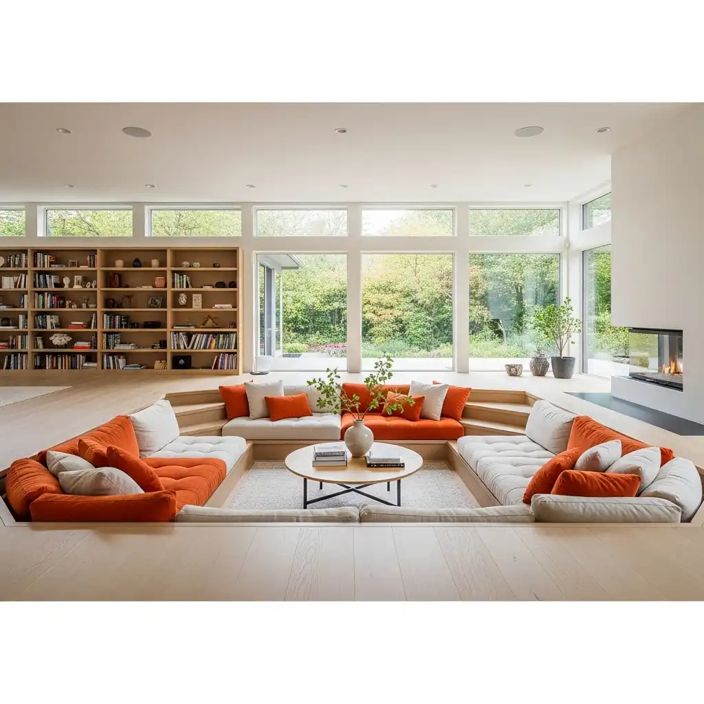 If your architecture allows, a sunken seating area defines the social heart of the home. It’s a classic 1960s feature that encourages face-to-face interaction.