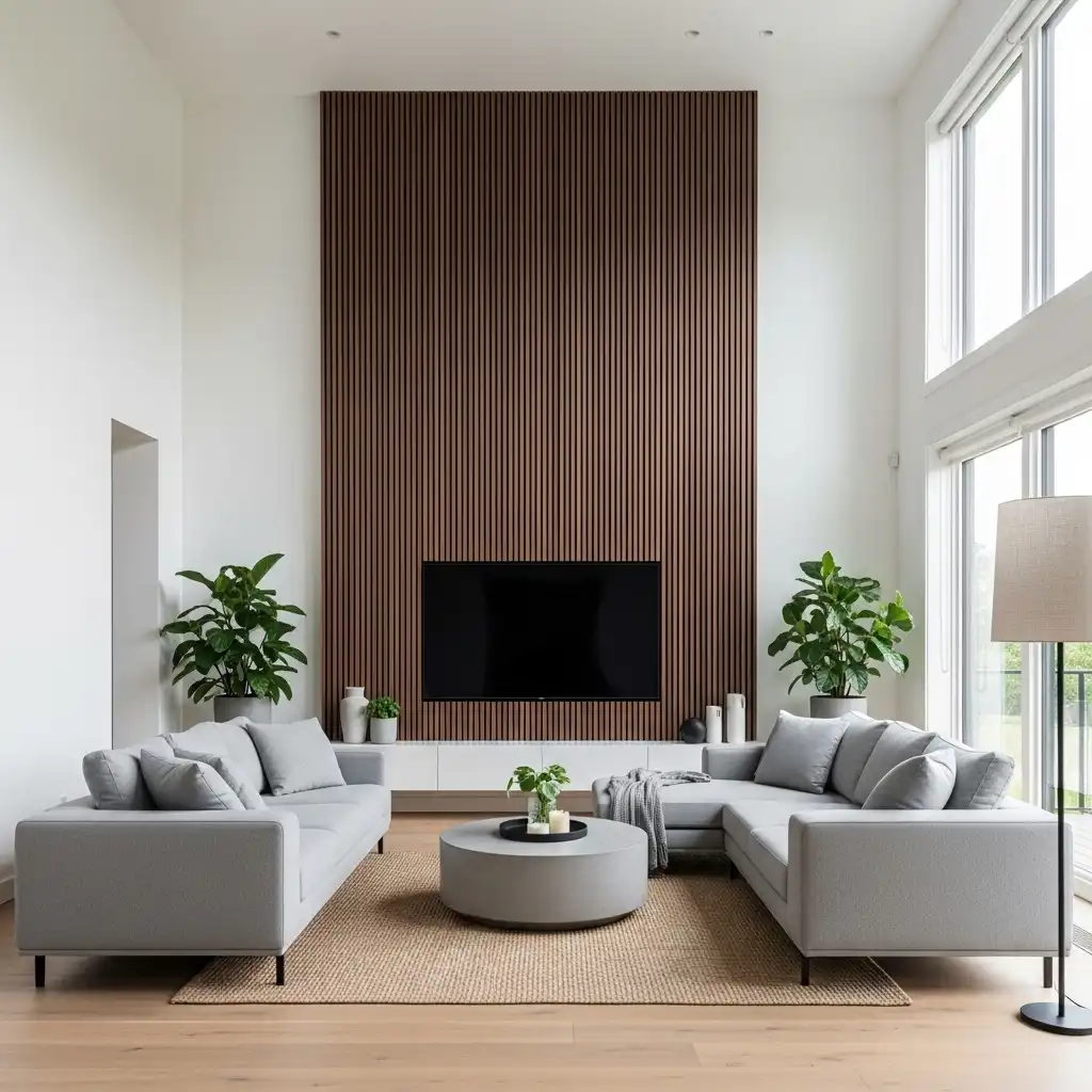 Install vertical or horizontal walnut slats to add warmth and rhythm. This architectural detail mimics the “room dividers” common in mid-century Californian homes.