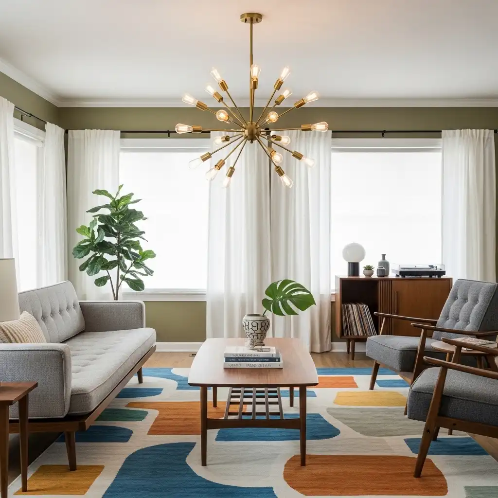 Introduce an architectural focal point with a multi-arm Sputnik chandelier. The brass or black metal “starburst” design adds a touch of space-age optimism to the ceiling.
