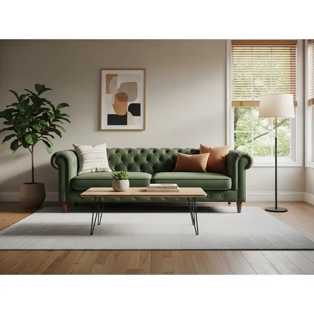 A low-profile sofa with thin, splayed wooden legs is the ultimate MCM anchor. This design keeps the visual weight light, making the living room feel more spacious and airy.