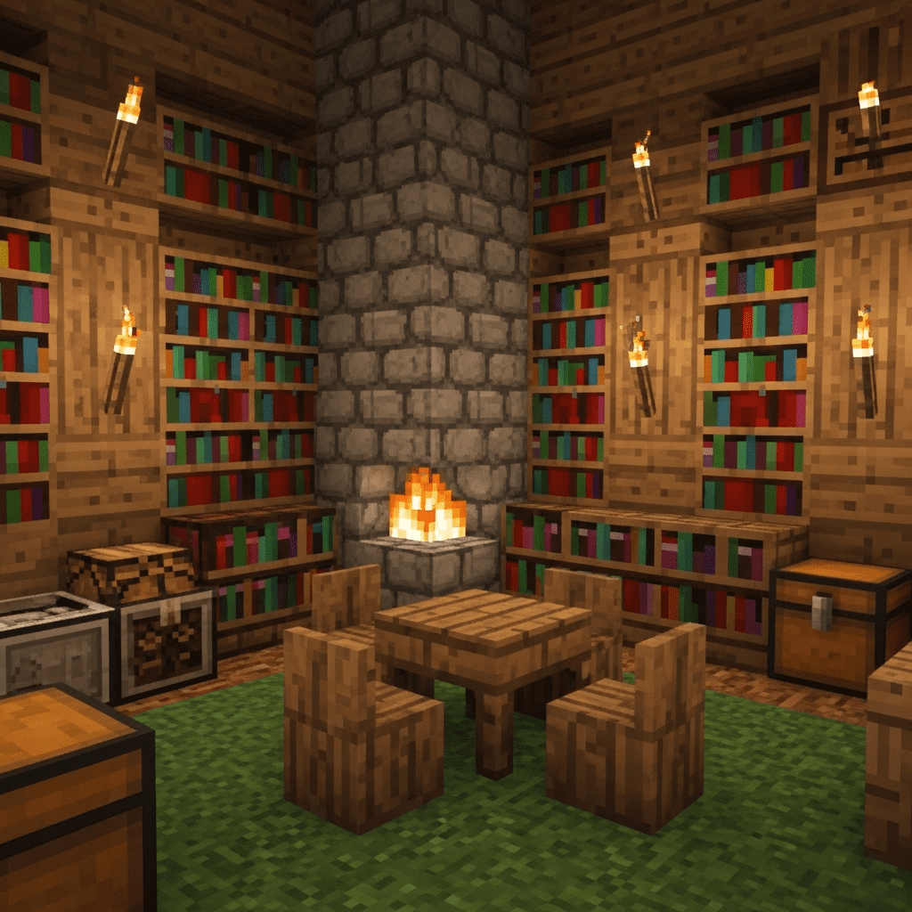 The quintessential Minecraft living room combines oak planks, cobblestone, and a crackling fireplace into a warm, inviting space. Bookshelves line the walls, a crafting table sits nearby, and torches cast flickering golden light across the entire room—pure Minecraft charm at its finest.