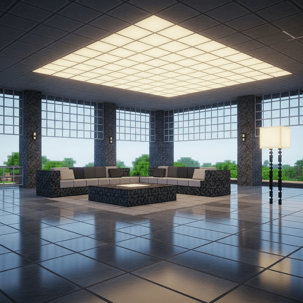Sleek glass walls, polished stone floors, and strategically placed glowstone blocks create a luxurious Minecraft mansion living room. Minimalist furniture arrangements and open floor plans mirror real-world luxury living translated into the game’s distinctive blocky aesthetic.