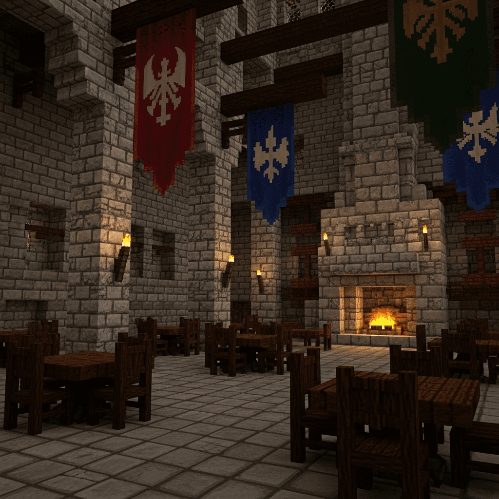Massive stone walls, a grand central fireplace, and rows of dark oak tables create an epic medieval atmosphere. Torches mounted on stone pillars, banners hanging from vaulted ceilings, and wooden chairs arranged around dining areas transform the space into an impressive castle great hall.