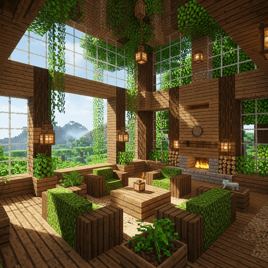 Elevated high among jungle wood trunks, this living room features wooden platforms, hanging vines, and open-air windows revealing lush jungle canopy views. The organic integration with surrounding nature creates a treehouse paradise that celebrates Minecraft’s biome diversity beautifully.
