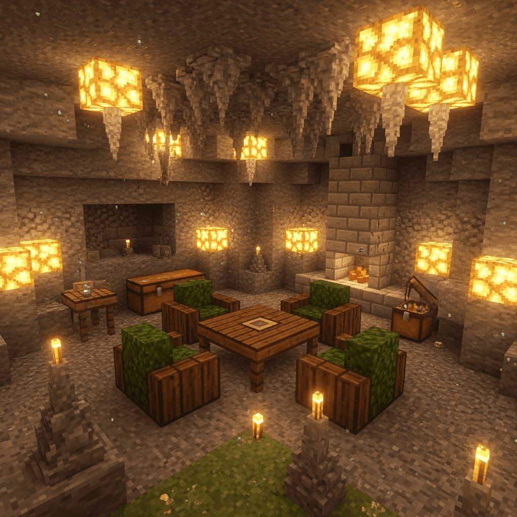 Carved directly into natural stone, this living room embraces Minecraft’s underground aesthetic. Glowstone clusters provide natural-looking illumination, stalactites hang overhead, and the raw, unfinished stone walls create a unique, adventurous living space unlike anything above ground.