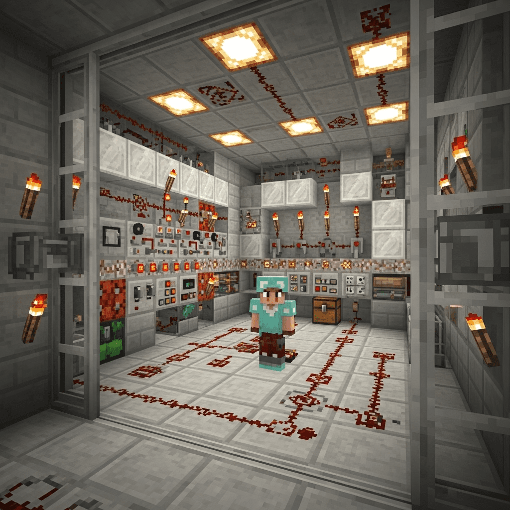 Featuring functioning redstone mechanisms—automatic doors, switchable lighting, hidden storage compartments, and powered pistons—this technically impressive living room demonstrates Minecraft’s engineering capabilities while maintaining comfortable aesthetics and livable design.