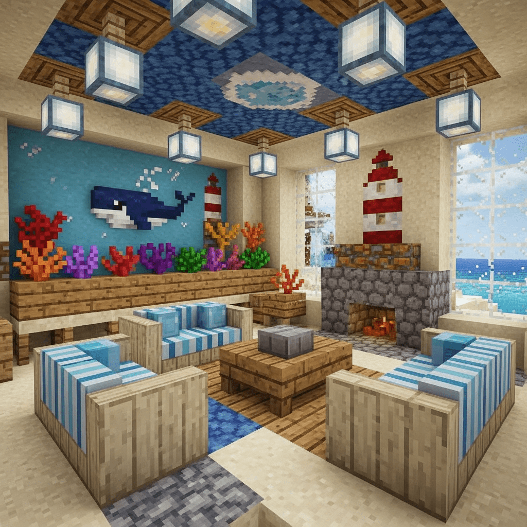Sand block floors, sea lantern lighting, and nautical-themed decorations create a breezy Minecraft beach house. Driftwood-style furniture, coral block accents, and strategically placed water features bring coastal charm to the pixelated world.
