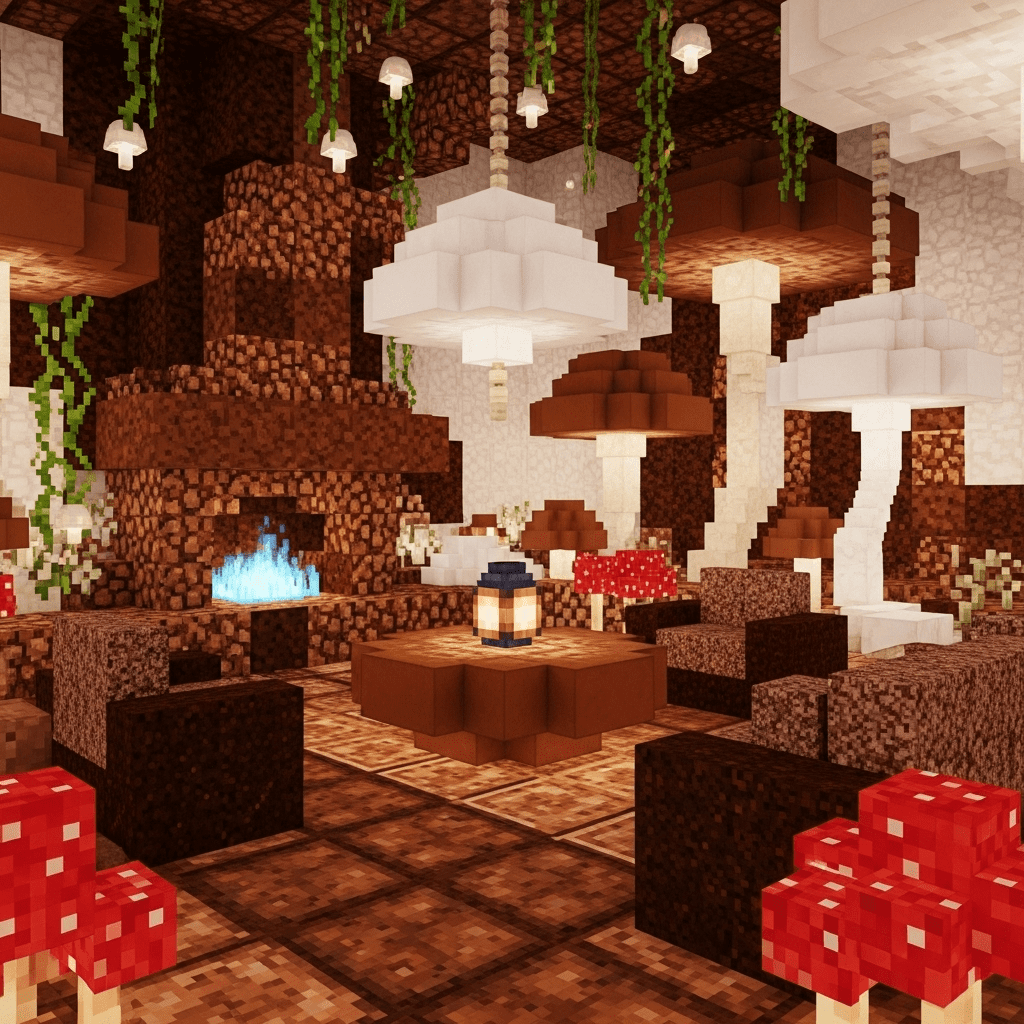 Built within the rare mushroom biome, this whimsical living room features mycelium floors, giant mushroom furniture, and soft brown and white colour schemes. The fantastical setting creates a magical, storybook atmosphere unique among all Minecraft biomes.