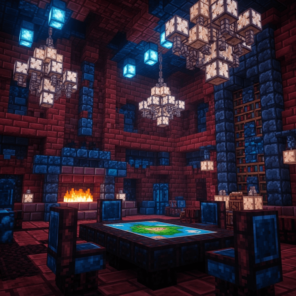 Dark red nether bricks, glowstone chandeliers, and fortress-style architecture create a dramatic villain-inspired living space. Obsidian accents, soul lanterns casting blue light, and intimidating stone pillars transform the living room into an impressive Nether fortress interior.