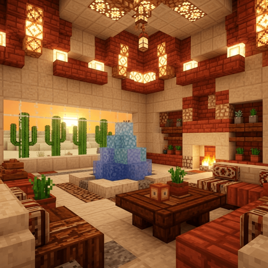Sandstone walls, red clay accents, and glowstone embedded in decorative patterns create an exotic desert villa living room. Cacti placed strategically outside windows and cool blue water features inside provide refreshing contrast to the warm desert colour palette.
