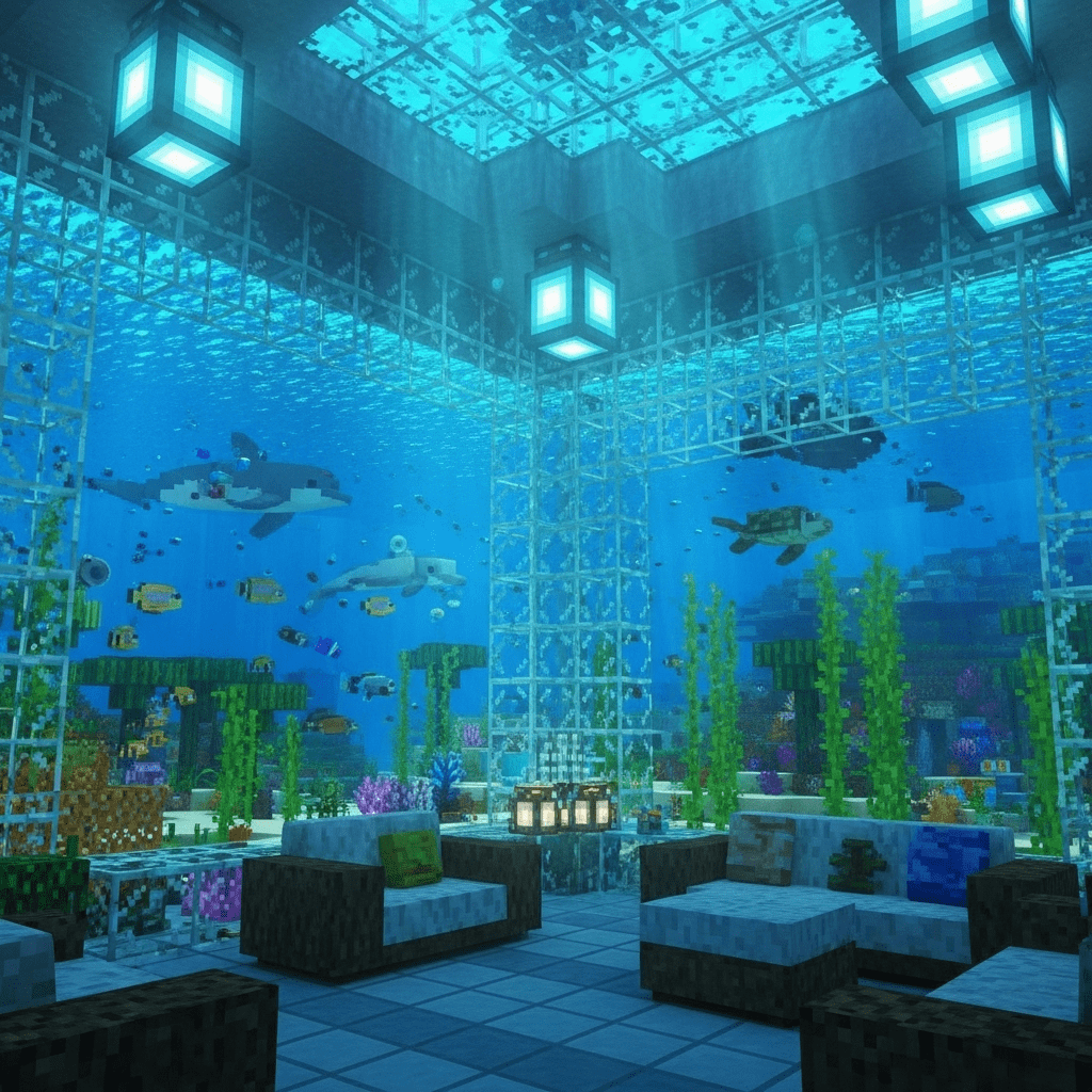 Built entirely beneath ocean surfaces, this extraordinary living room features glass block walls revealing stunning underwater views. Sea lanterns provide ethereal blue lighting while coral, kelp, and marine life visible through walls create a mesmerising aquatic atmosphere.