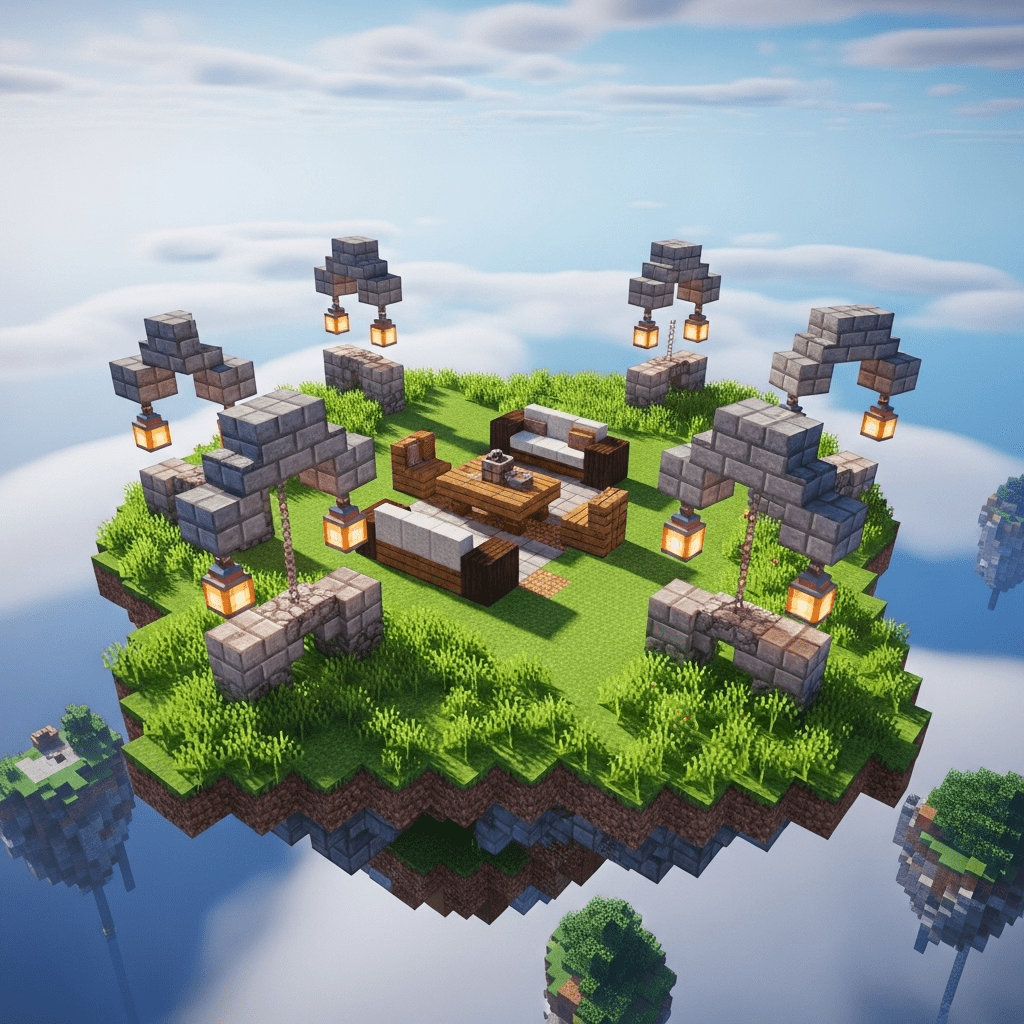 Suspended high above the clouds on floating grass and stone blocks, this sky-high living room offers breathtaking aerial views in every direction. Glowstone and lanterns illuminate the space while the limitless sky stretching infinitely below creates an awe-inspiring, vertigo-inducing living experience.