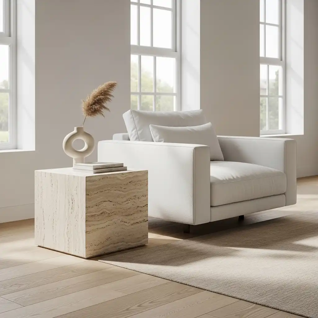 Use solid blocks of travertine or marble as side tables or plinths for sculpture. The weight of the stone feels ancient, while the geometric cube shape is purely modern.