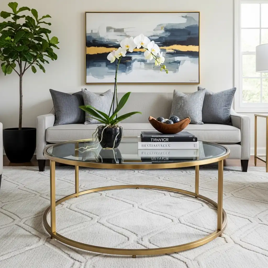 A glass-topped table with a thin brass frame offers a “jewelry” effect. The transparency keeps the room feeling open, while the gold finish provides a traditional touch of warmth.