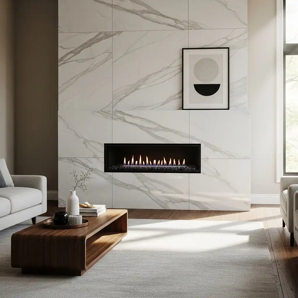 Upgrade a traditional fireplace with a seamless marble surround. Keeping the mantel minimalist and clutter-free ensures the stone’s natural veining remains the star of the room.