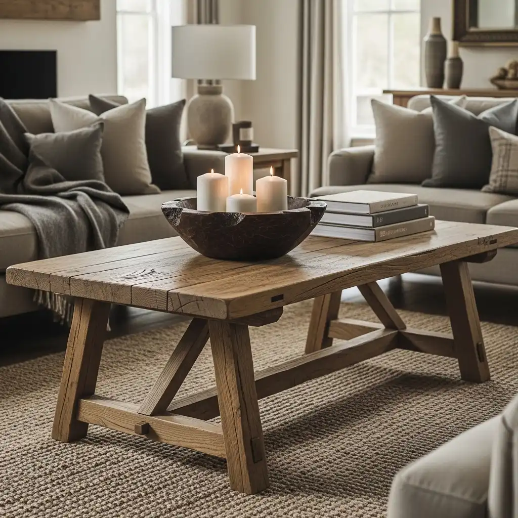 Choose a heavy wooden coffee table with a trestle base. The substantial proportions anchor the seating area and reflect the sturdy craftsmanship of traditional farm furniture.