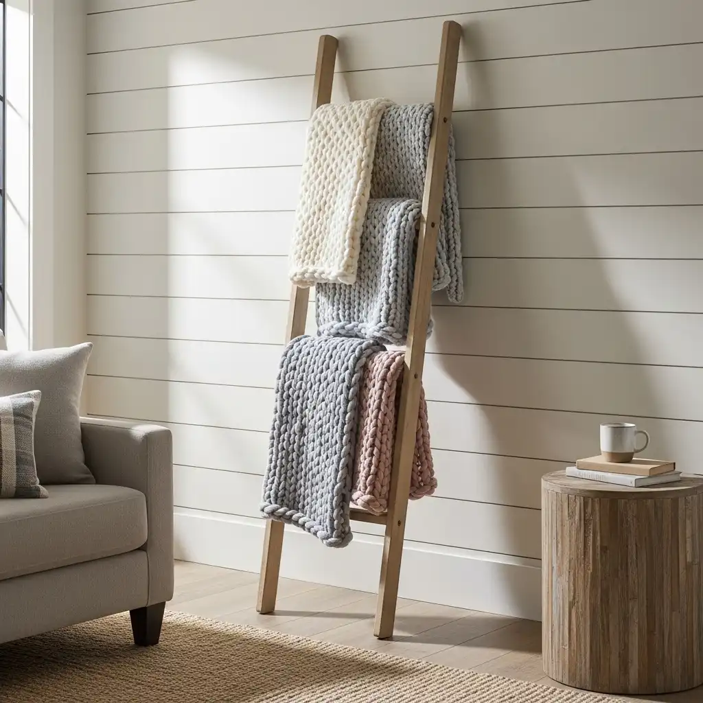 Decorate with vintage-inspired pieces like an old wooden ladder used as a blanket rack or an antique trunk as a coffee table to ground the room in nostalgia.