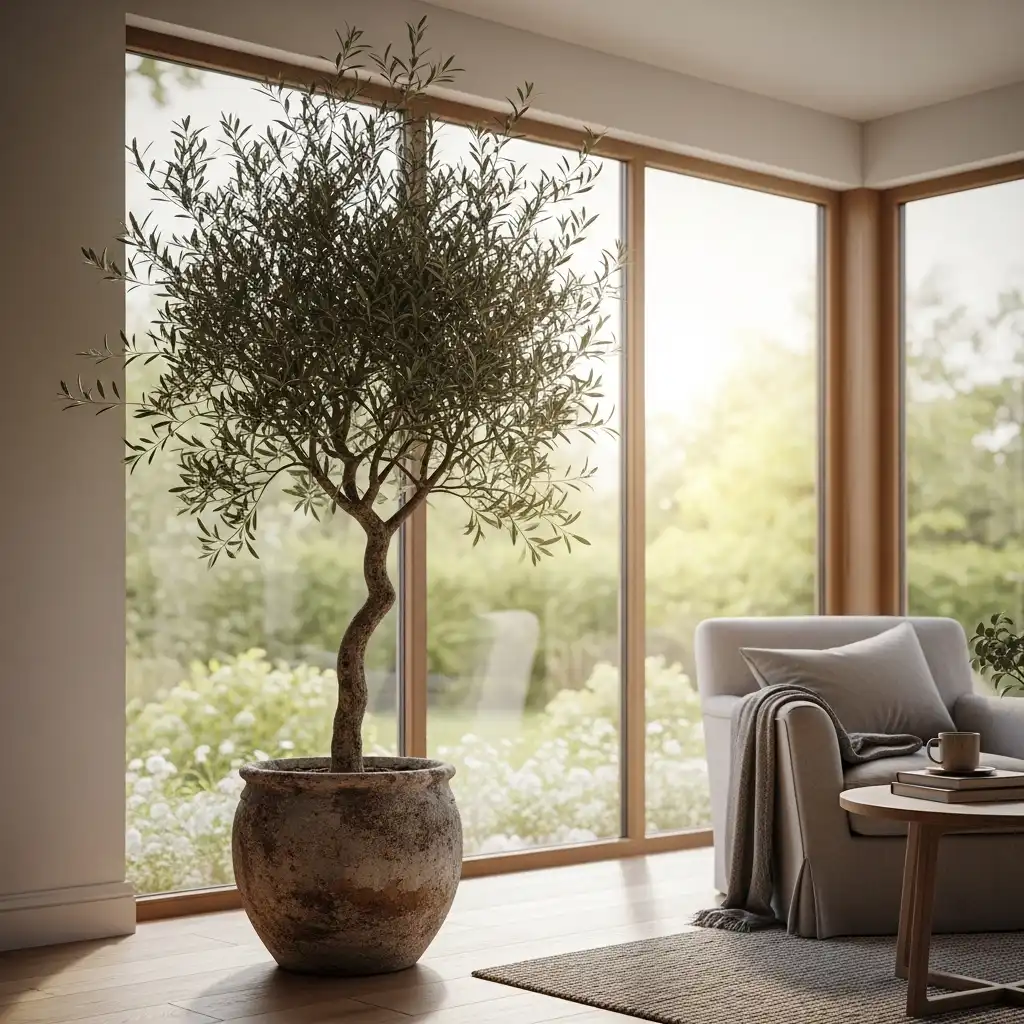 Place a tall, spindly olive tree in a terracotta or stone pot. The silvery-green leaves add a Mediterranean-farmhouse touch that feels more refined than a standard tropical plant.