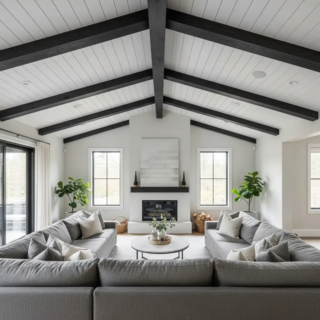 Leave ceiling beams exposed and stain them in a light oak or dark walnut. This emphasizes the room’s height and adds a “barn-like” architectural soul to the interior.