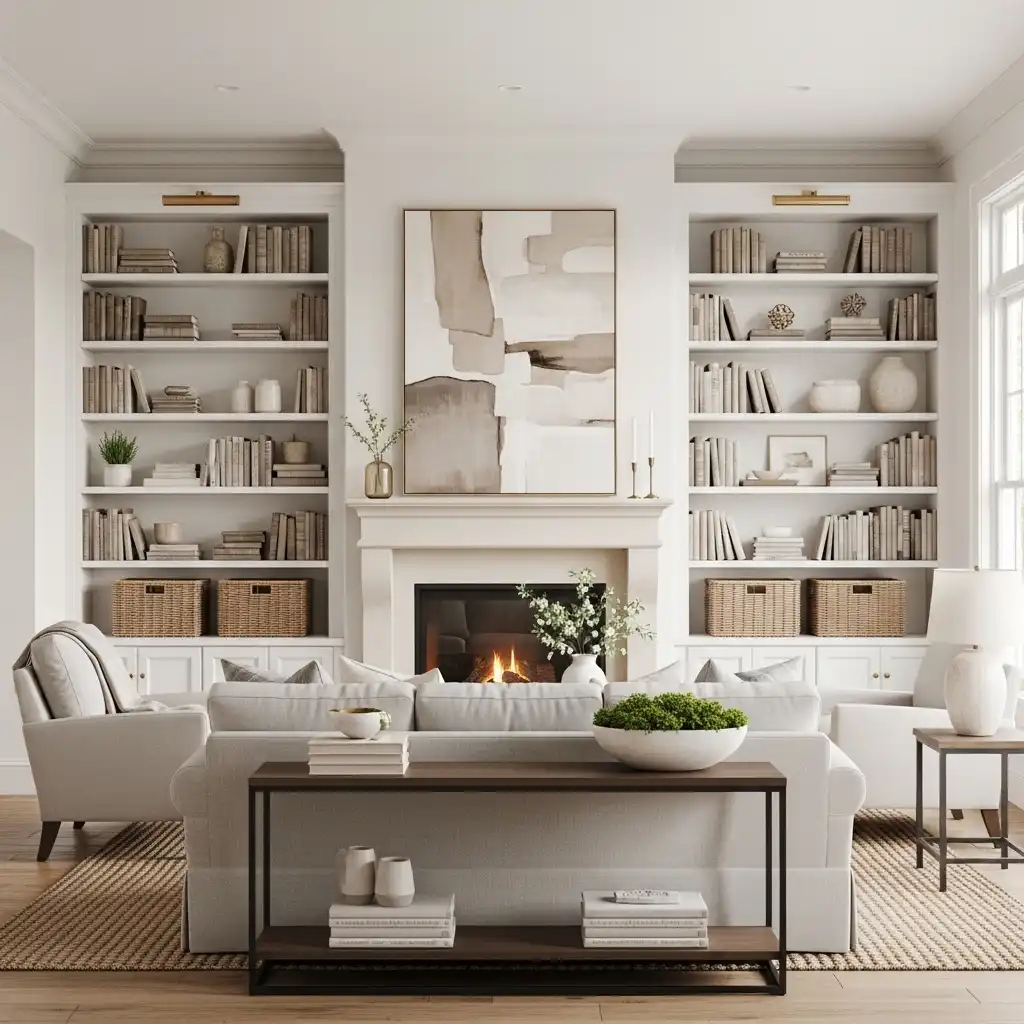 Install floor-to-ceiling white built-in shelves flanking a fireplace. Styling them with a mix of books, woven baskets, and stoneware adds a curated, lived-in feel to the suite.