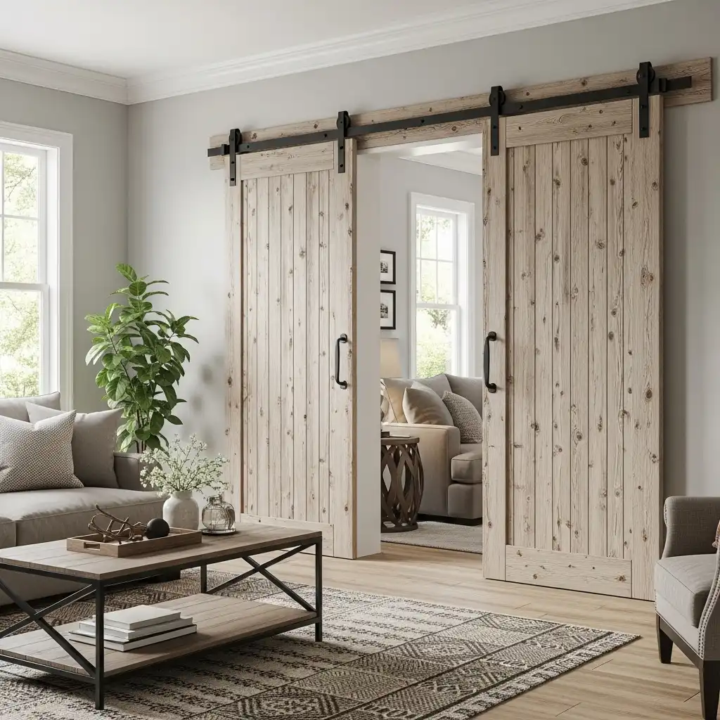 Use a sliding barn door on a black iron track to conceal a television or separate the living room from a hallway. It serves as functional hardware and large-scale rustic art.