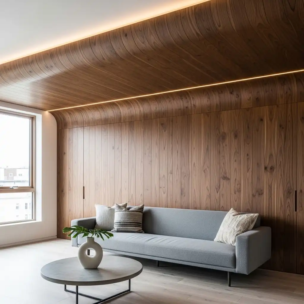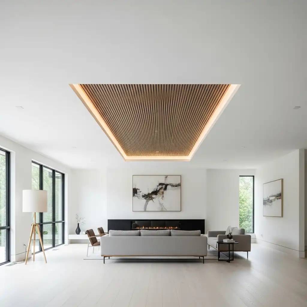 Incorporate parallel walnut or oak slats into a recessed section of the ceiling. This adds organic texture and improved acoustics to a modern, open-concept space, bridging the gap between nature and architecture.