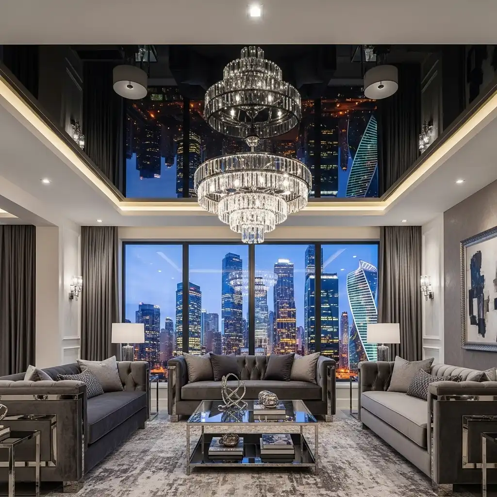 Utilize a PVC stretch material with a mirror-like finish. A high-gloss black or navy ceiling reflects the entire room and the view outside, creating an illusion of infinite vertical space.