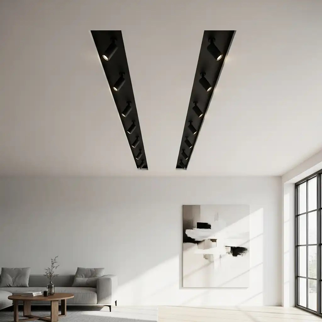 Install narrow, deep black-painted trenches into a white ceiling to house spotlights. This “stealth” lighting design hides the fixtures themselves, leaving only the focused beams of light visible.
