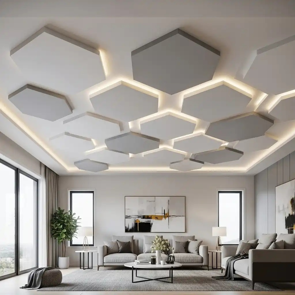 Use gypsum board to create overlapping 3D shapes or “honeycomb” patterns. This sculptural approach turns the ceiling into a piece of modern art, especially when accentuated by strategic spotlighting.