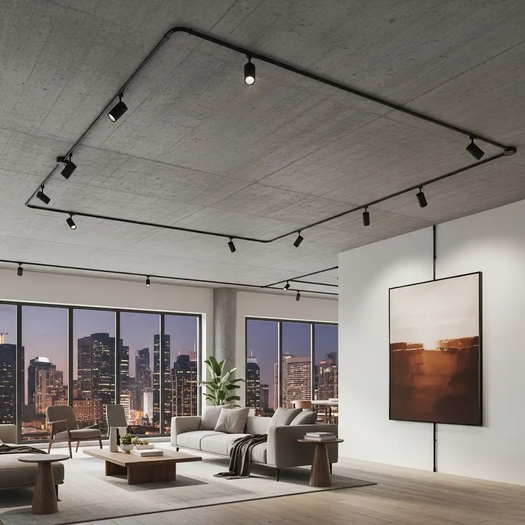 For an urban loft aesthetic, leave the structural concrete ceiling exposed. The raw, grey texture provides a moody, sophisticated backdrop that pairs perfectly with black track lighting and leather furniture.