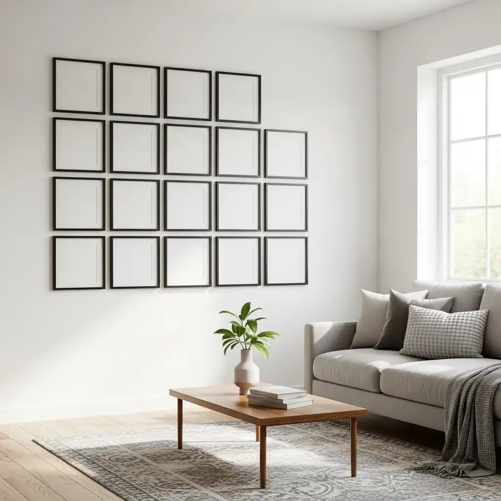 Display a perfectly symmetrical grid of black-and-white photos with oversized white matting. This creates a clean, professional, and museum-like atmosphere.