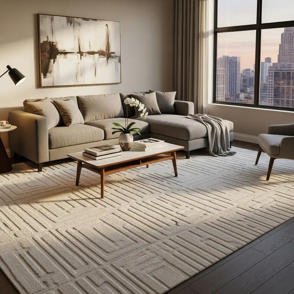 Choose a rug with a high-low pile height in a single color. This creates a subtle, carved pattern that adds visual interest without introducing busy colors.