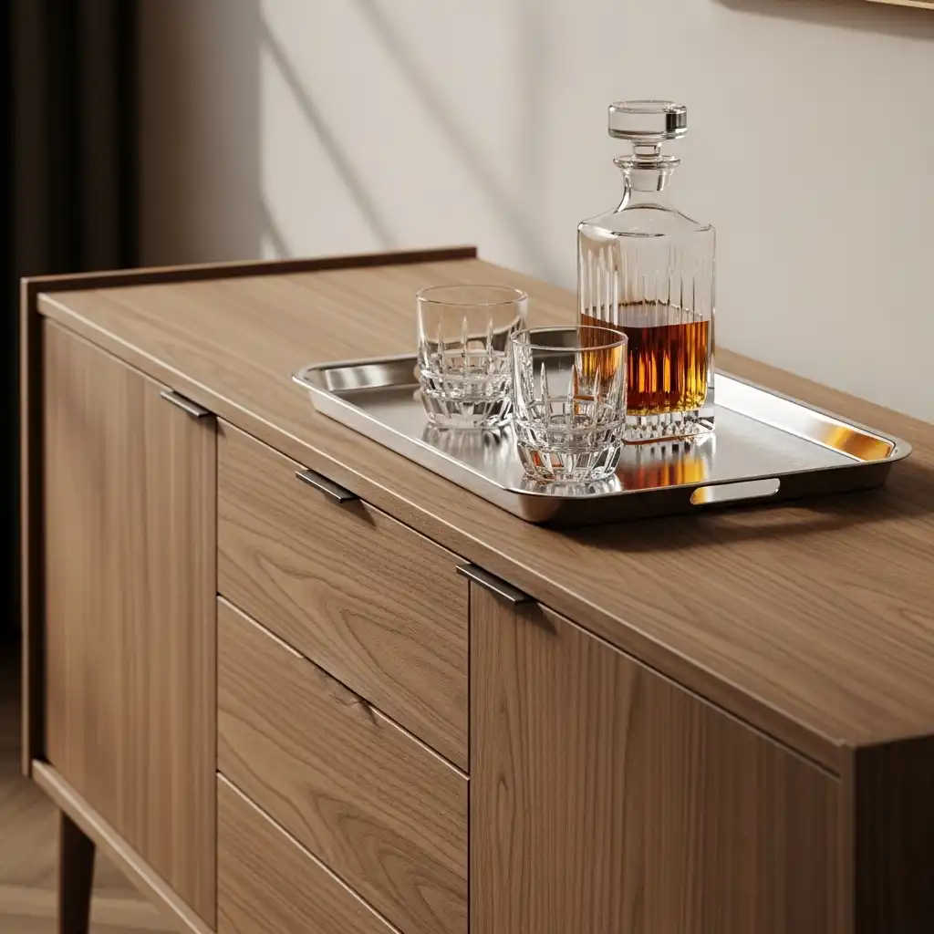 Set up a curated bar tray on a sideboard with a crystal decanter and high-quality glassware. It adds a touch of executive-level sophistication and hospitality.