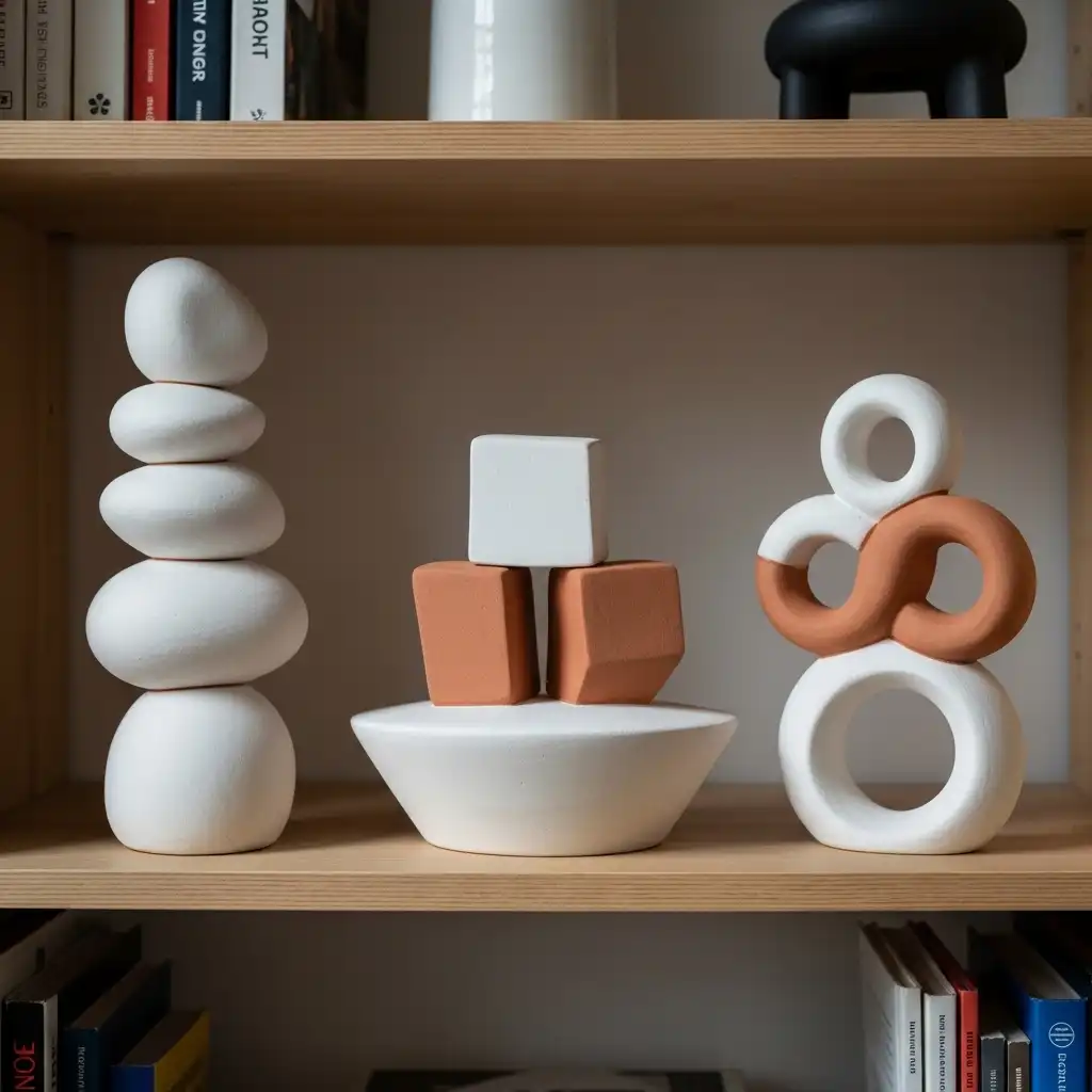 Decorate shelves with matte ceramic sculptures in organic, tiered shapes. These “totems” act as modern totems that add an artisanal, handcrafted feel.