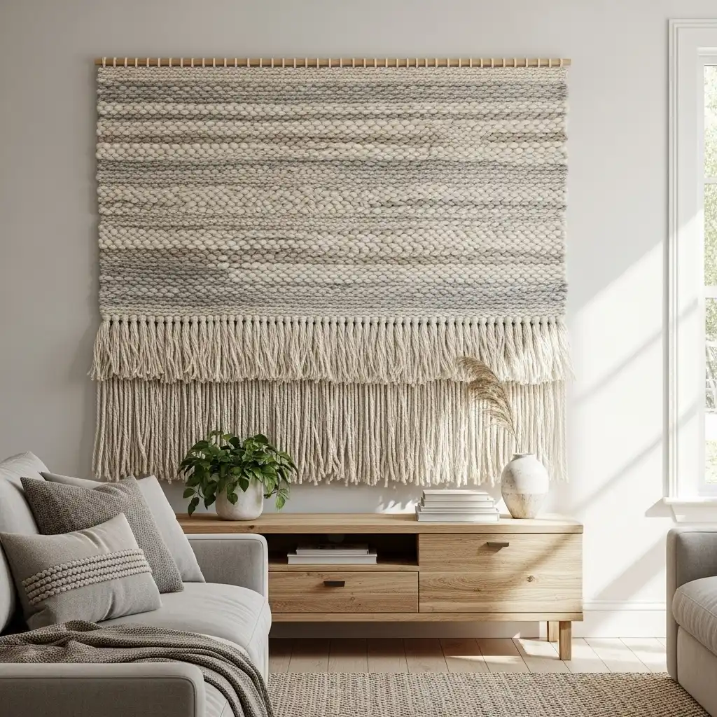 Add soft texture with a modern woven wall hanging or a minimalist tapestry. This breaks up the “hard” surfaces of a modern room and improves acoustics.