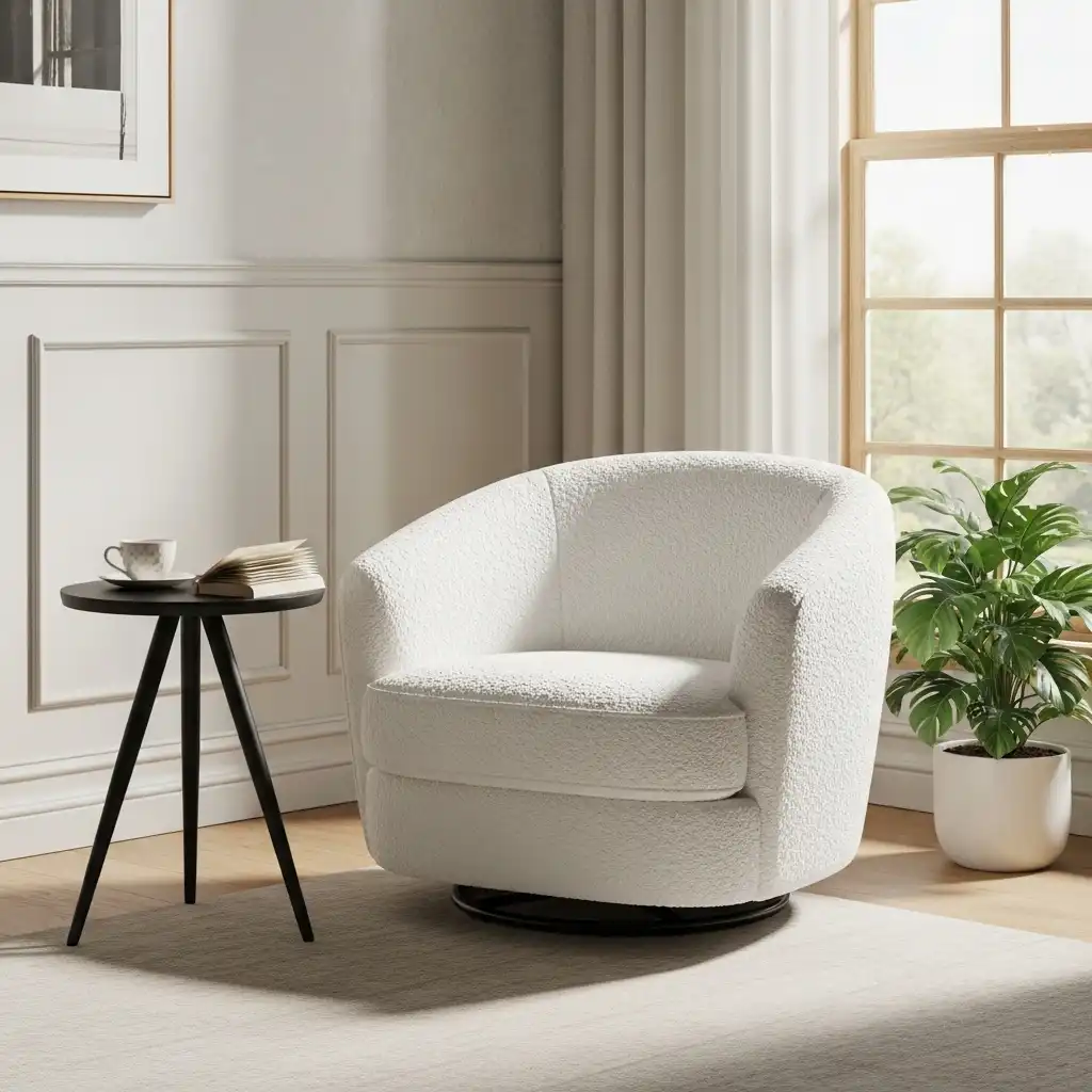 Introduce the “nubby” texture of bouclé fabric through a single accent chair. This material is a staple of modern luxury, providing warmth and a cozy, organic feel.