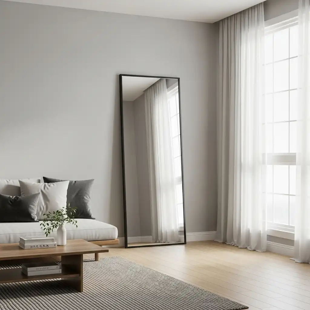 Lean an oversized, thin-framed floor mirror against a wall. It reflects light, doubles the perceived space, and serves as a sleek piece of functional decor.