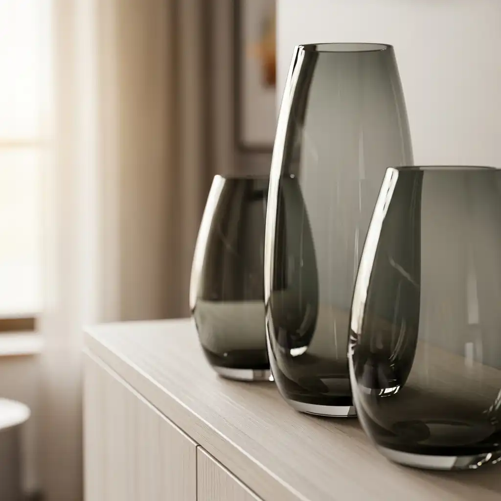 Use tinted or smoked glass vases in clusters of three. The translucent, moody material adds a touch of mid-century glamour to shelves or consoles.