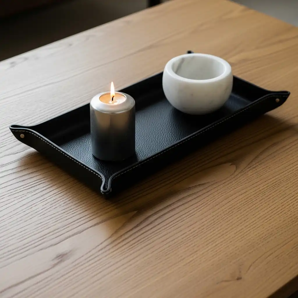 Group small items like remotes, coasters, and candles on a sleek metal or leather tray. This keeps surfaces organized and makes small accessories look like a curated collection.
