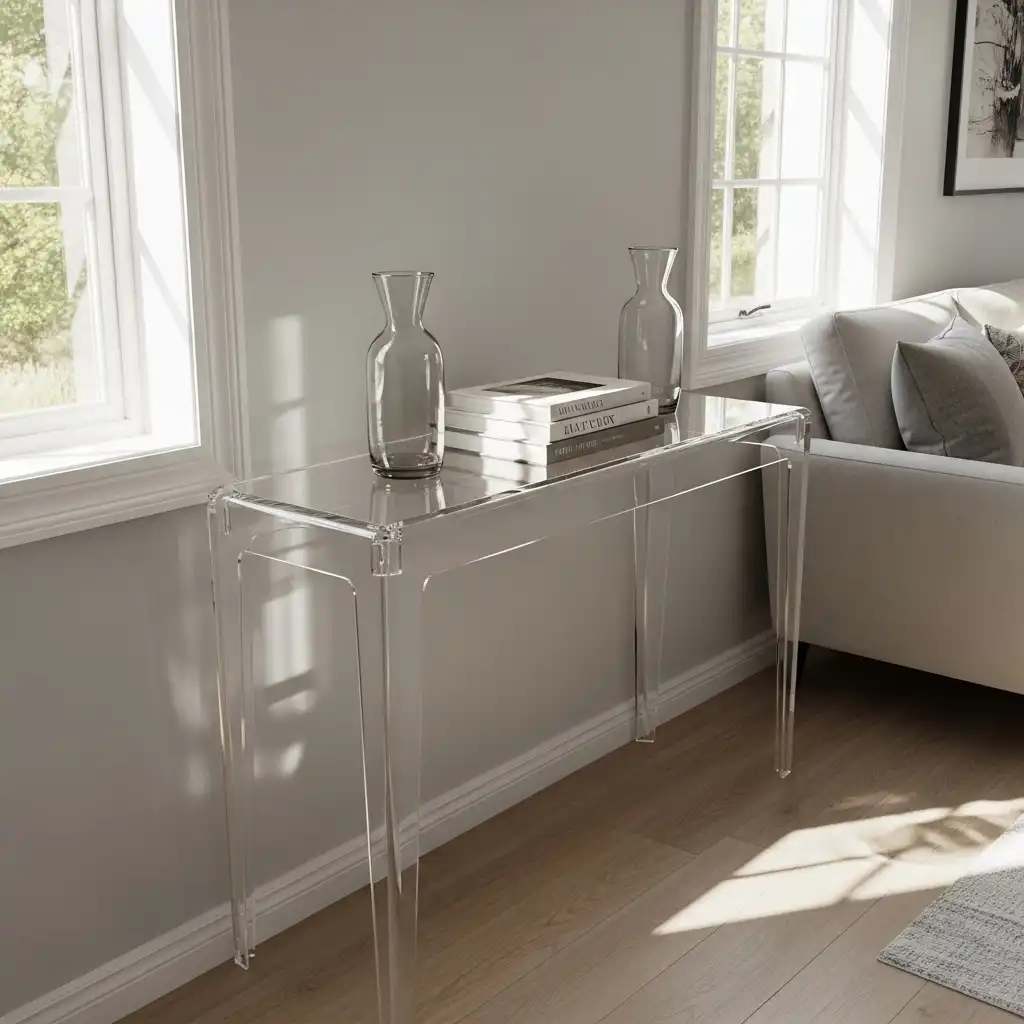 Utilize a clear Lucite or acrylic console table behind a sofa or in an entryway. It provides a functional surface for decor without adding visual “clutter” to the room.