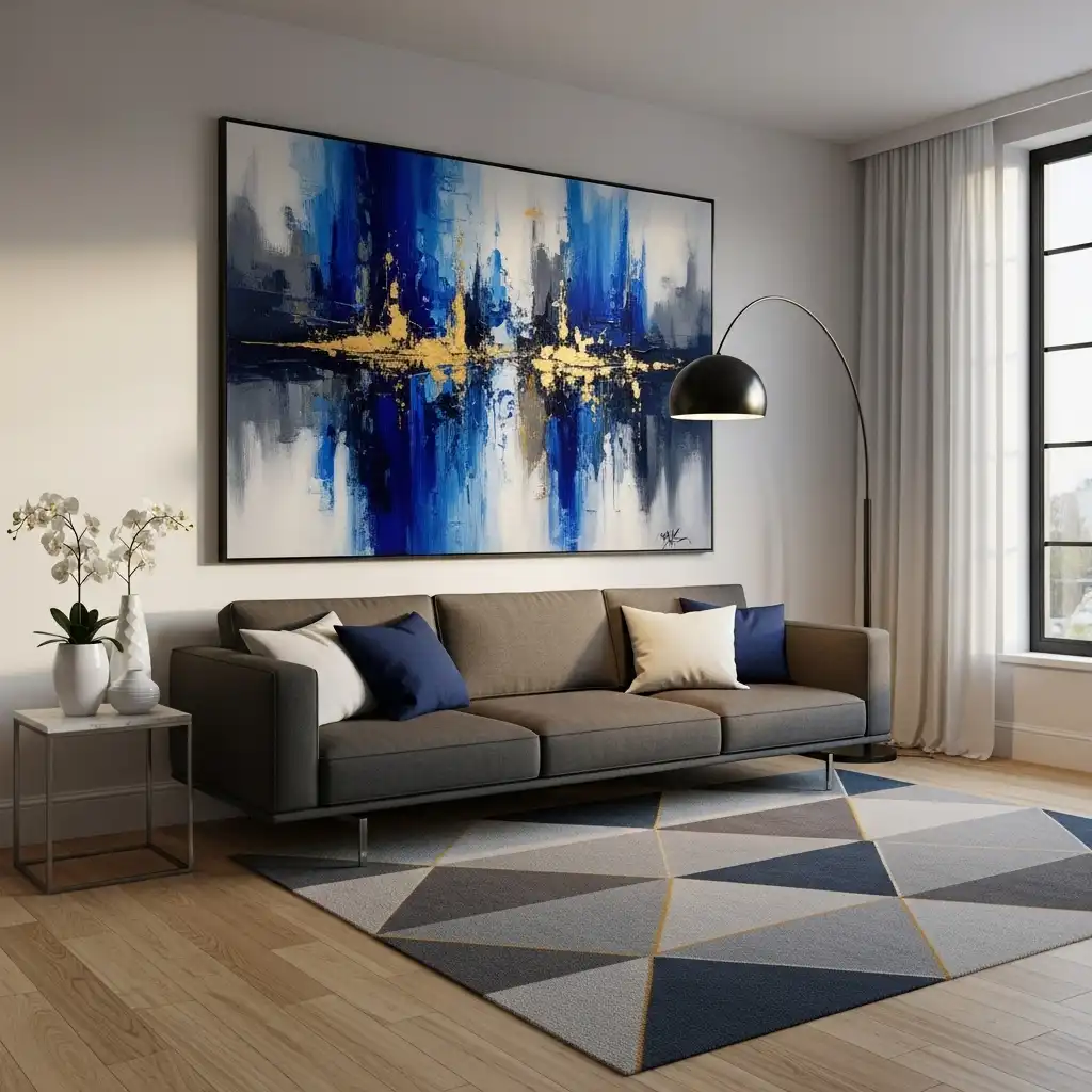 Make a bold statement with a single, oversized abstract painting. This serves as the room’s primary color anchor and eliminates the need for cluttered wall decor.