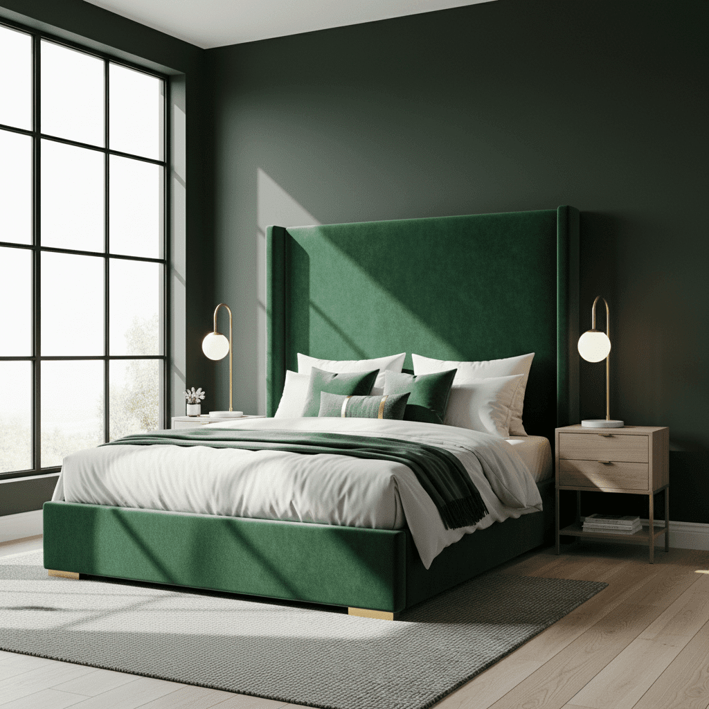 Emerald green is a cornerstone of moody design. An oversized velvet headboard in this rich shade provides a plush, royal focal point that glows under soft evening light.