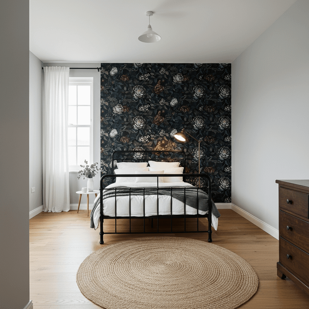 Oversized botanical prints on a black or navy background add a touch of Victorian-inspired drama. This works exceptionally well for creating an “enchanted garden” vibe in a guest space.