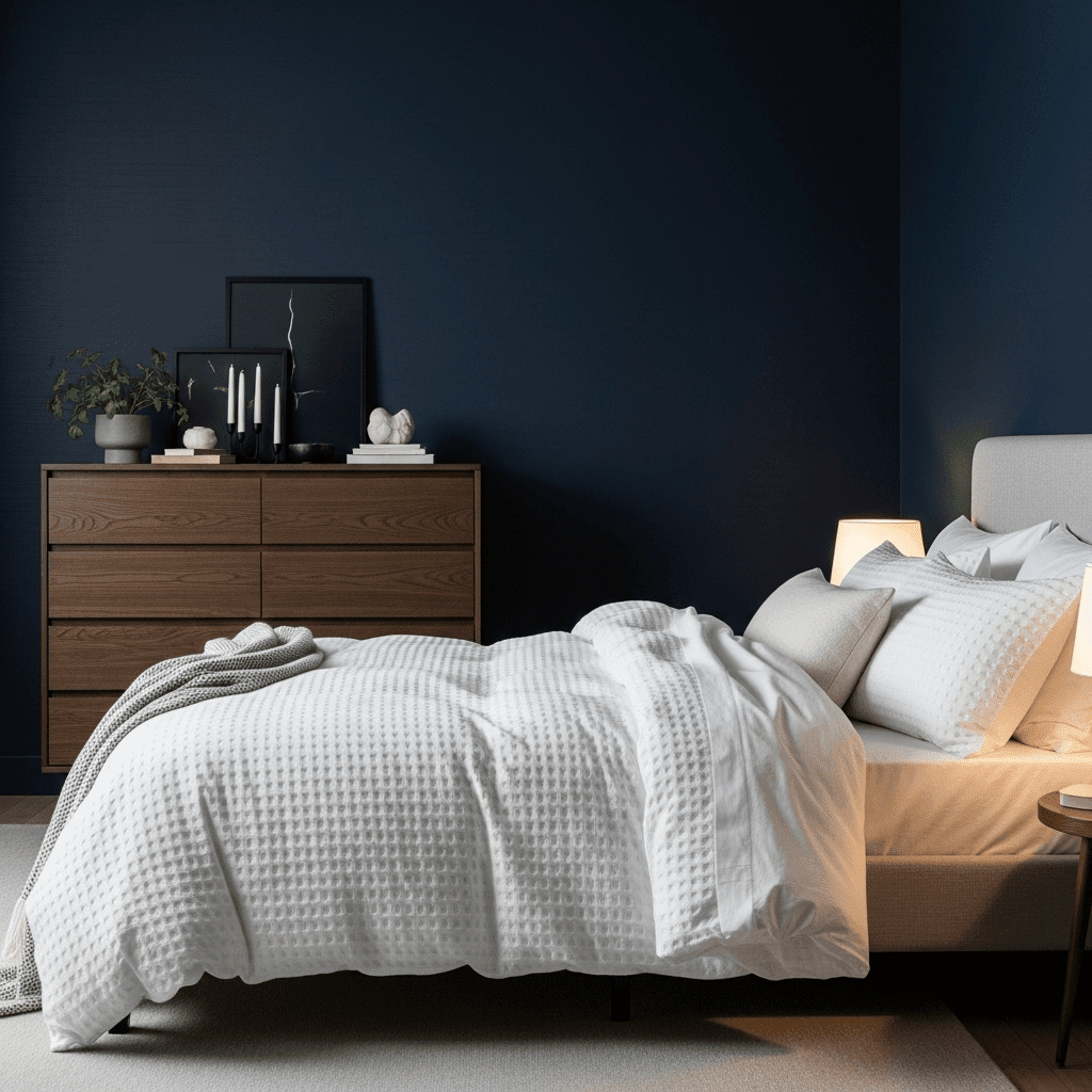 Navy blue is a versatile moody shade that feels both classic and daring. Pair it with crisp white pillows to create a high-contrast look that mimics the night sky.