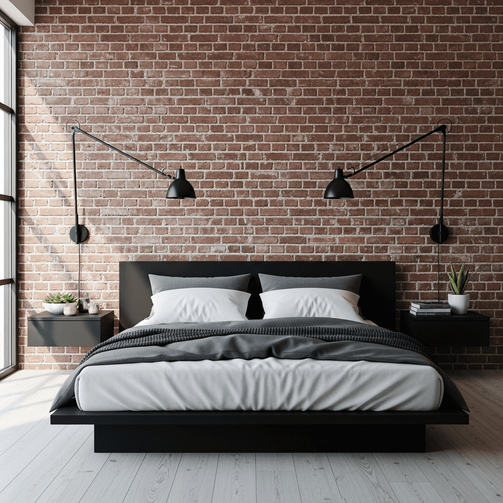 Exposed dark brick paired with matte black metal accents creates an urban, moody loft aesthetic. It’s a great way to add “edge” to a guest room while keeping it cozy.