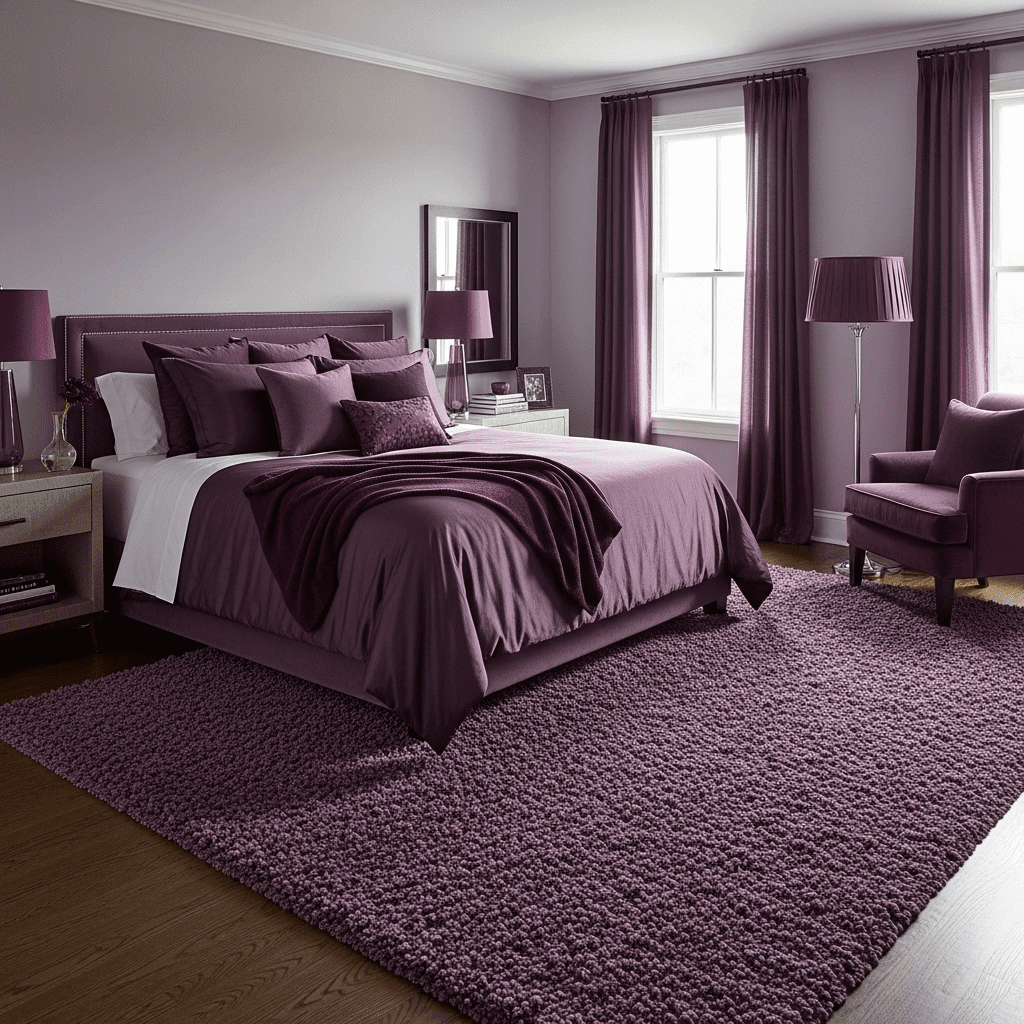Plum or eggplant purple is an unexpected moody choice that feels incredibly luxurious. Layering these tones through the rug and duvet creates a regal, soft atmosphere.