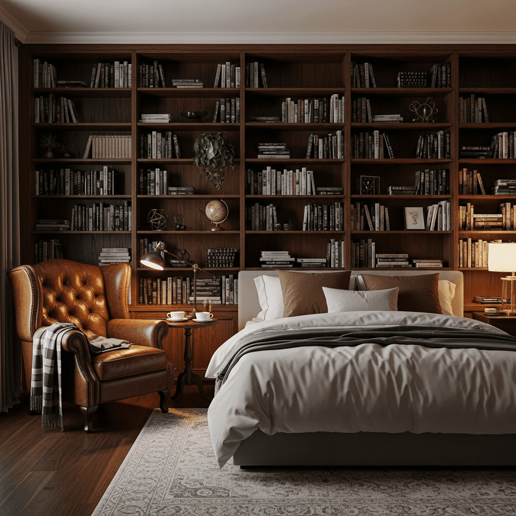 Line the walls with dark wood bookshelves and a small leather armchair. This turns the guest room into a scholarly retreat that feels lived-in and secretive.