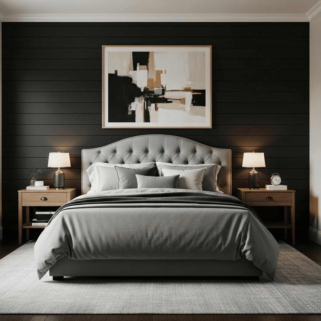 For a modern-rustic moody look, use black stained shiplap. The shadows between the planks add subtle linear interest without breaking the dark color scheme.